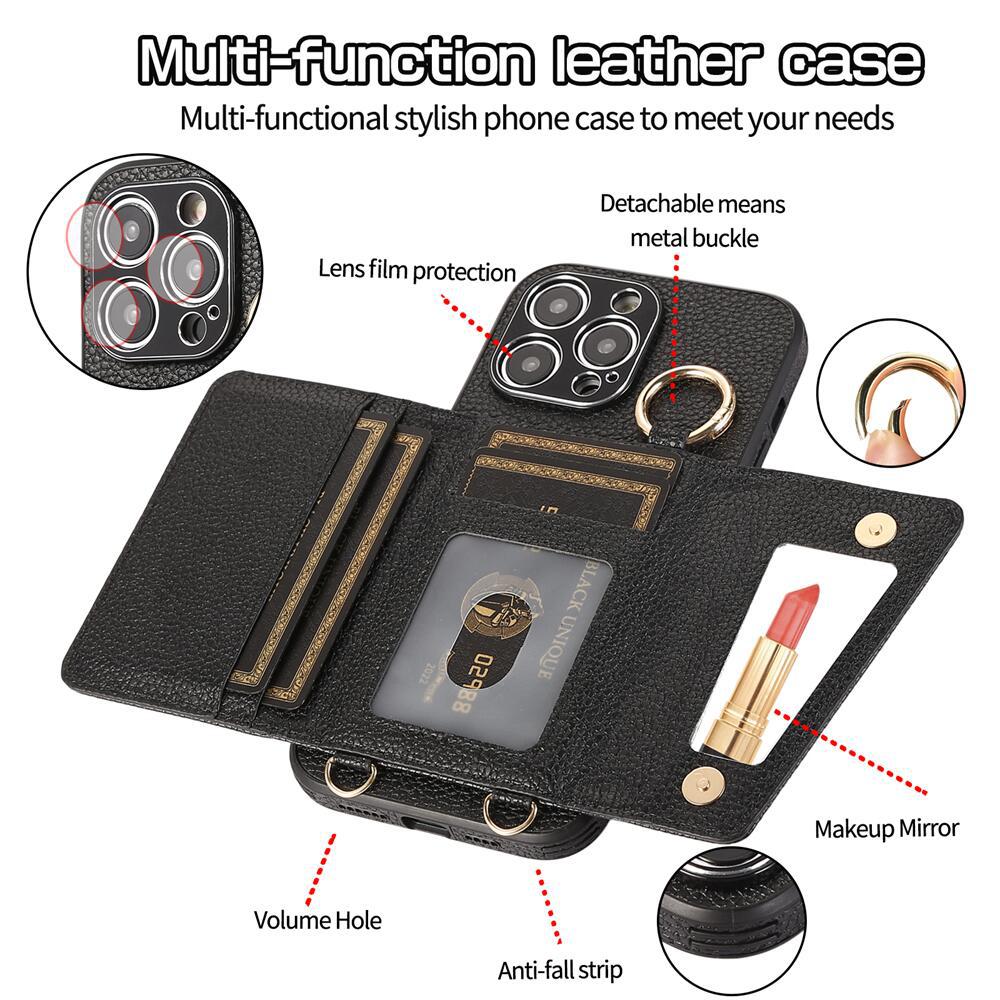 Luxurious Leather Card Holder Anti-fall Protective iPhone Case With Lanyard & Mirror