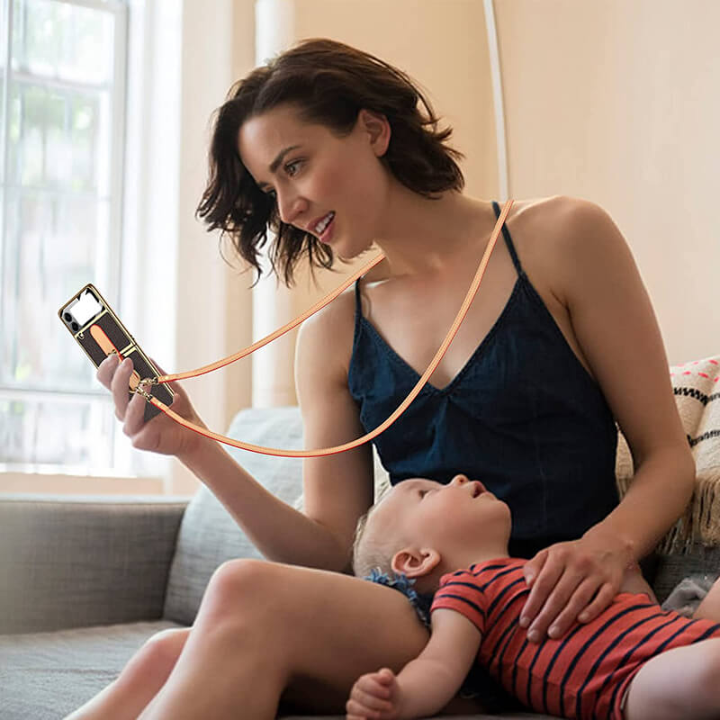 Luxury Leather Back Screen Tempered Glass Hard Frame Cover For Samsung Galaxy Z Flip4 Flip3 5G With Lanyard