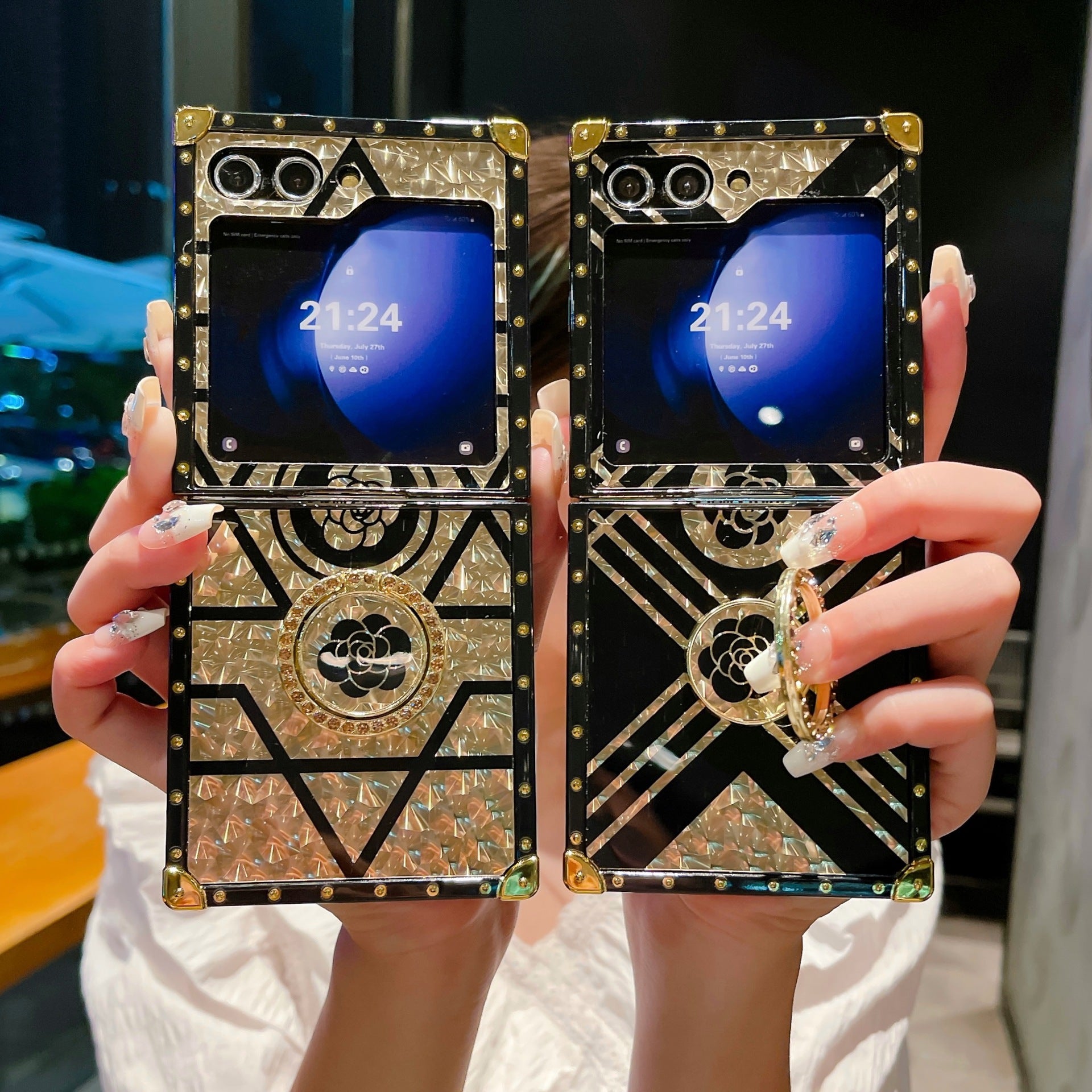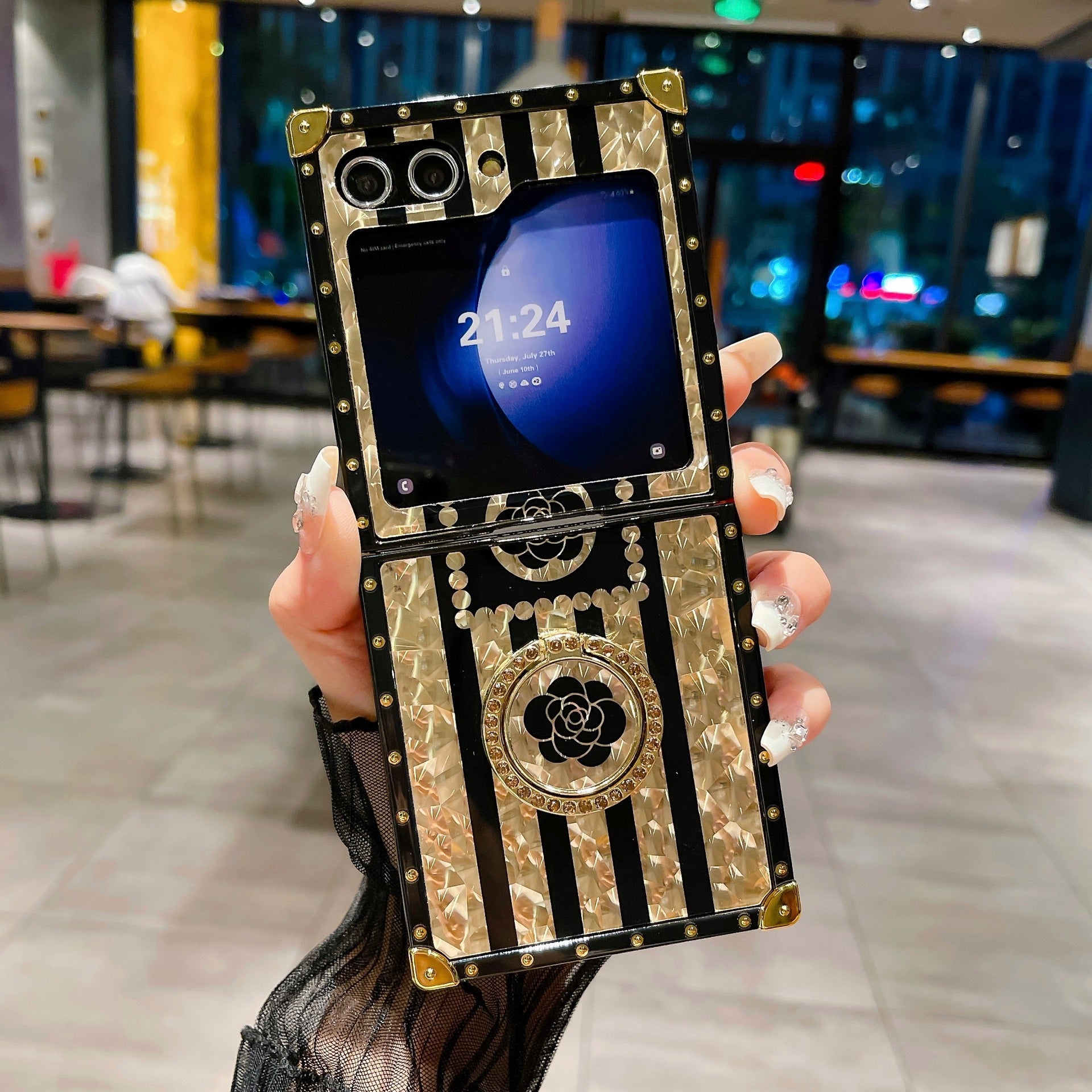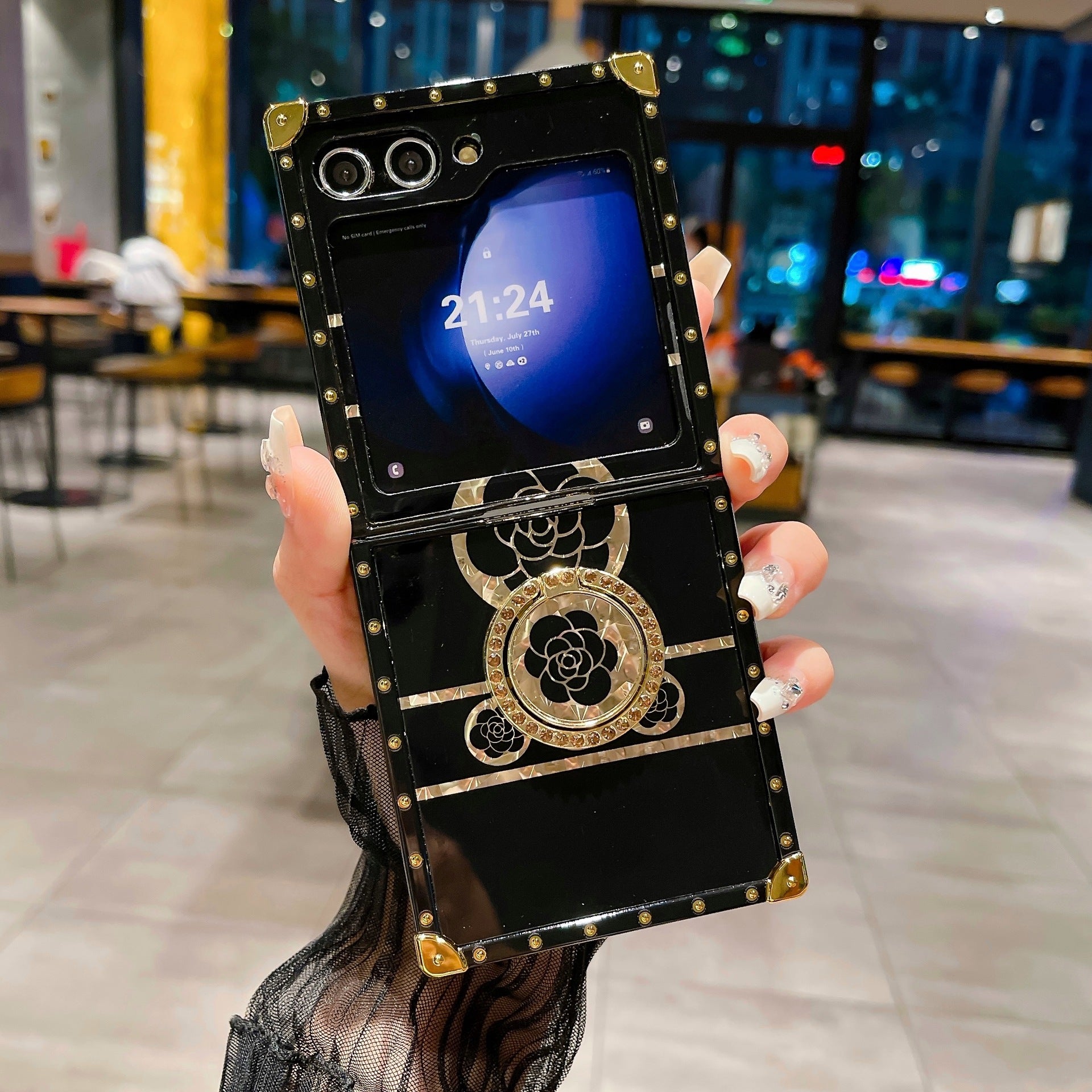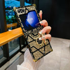 Luxury Brand Black Rose Flower Stripe Glitter Gold Phone Case With Ring & Lanyard For Samsung Galaxy Z Flip5 Flip4 Flip3