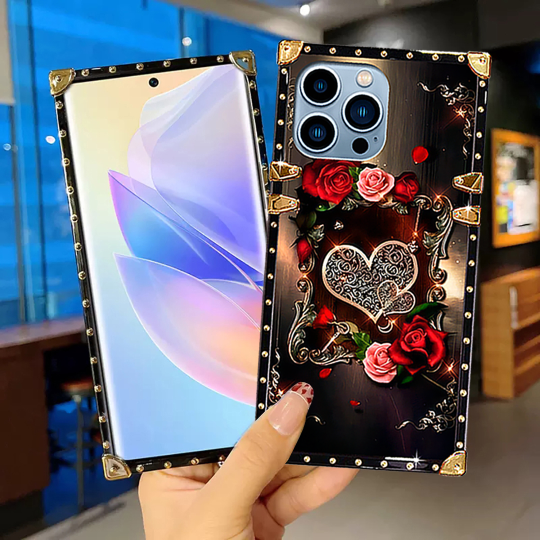 Luxury Brand Rose Heart Gold Square Case For iPhone
