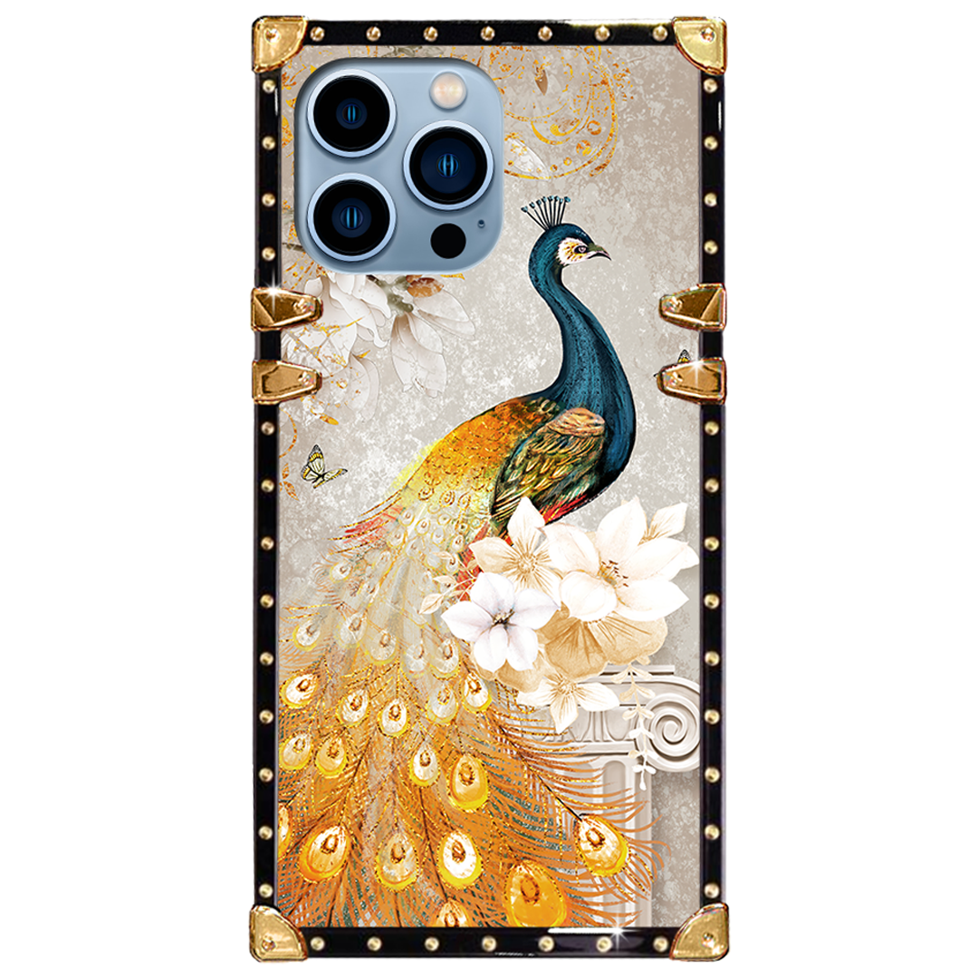 Luxury Brand Peacock Pattern Gold Square Case For iPhone