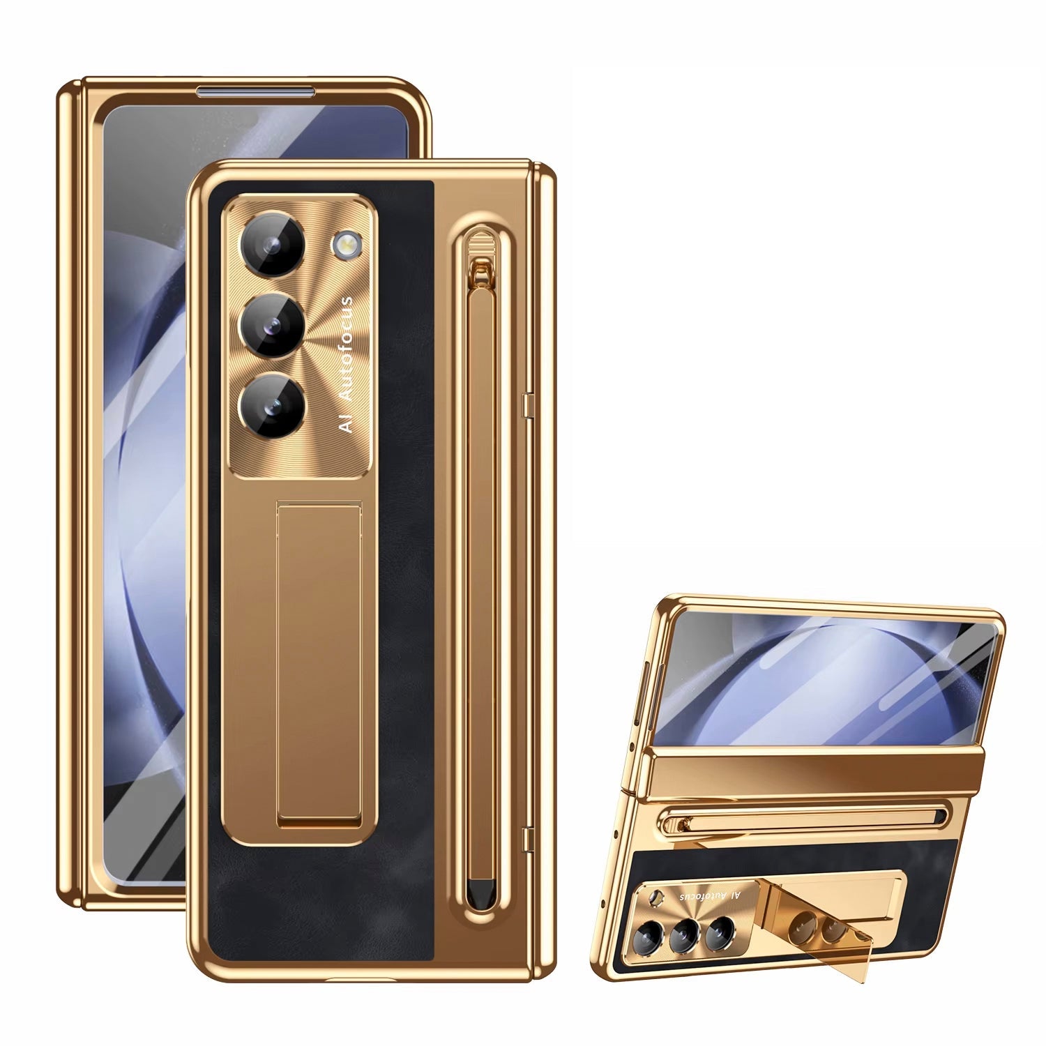 Leather Golden Electroplated Phone Case With Back Screen Glass and Stylus For Galaxy Z Fold 7/6/5/4